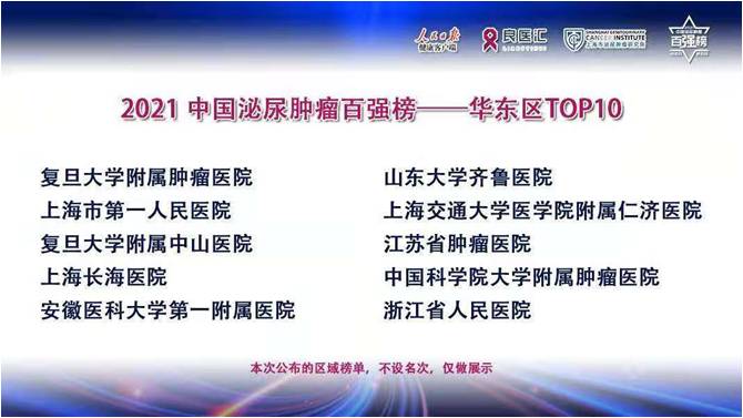 由良医汇、上海市泌尿肿瘤研究所共同主办,人民日报健康客户端全程推广及媒体支持的2021年度《中国泌尿肿瘤百强榜》区域榜于7月10日发布,共50个泌尿肿瘤MDT团队上榜。安徽医科大学第一附属医院泌尿肿瘤MDT团队入围华东区域排行榜top10,排名第五。