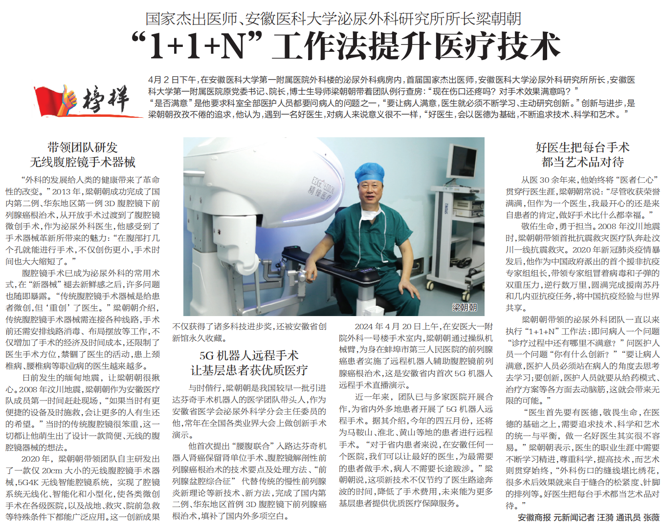 4月2日下午,在安徽医科大学第一附属医院外科楼的泌尿外科病房内,首届国家杰出医师,安徽医科大学泌尿外科研究所所长,安徽医科大学第一附属医院原党委书记、院长,博士生导师梁朝朝带着团队例行查房:“现在伤口还疼吗?对手术效果满意吗?”